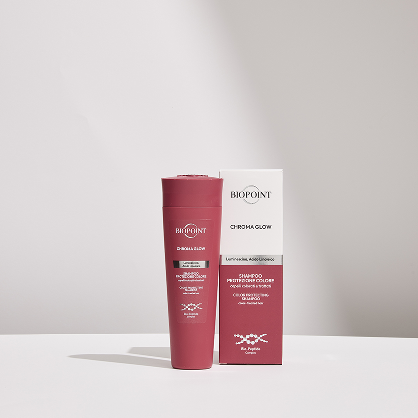 dona brillantezza e vivacità al colore. Il trattamento con la linea completa Chroma Glow crea una barriera invisibile che protegge i capelli dallo stress termico fino a 230 °C, aiutando a mantenere la cuticola compatta e sana. Un capello sano, con cuticole sigillate, riflette la luce in modo uniforme, esaltando i riflessi e la profondità del colore.