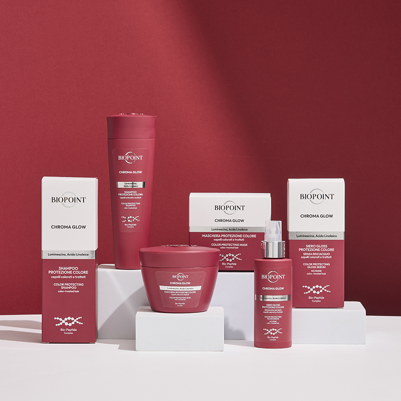 *Instrumental tests carried on Chroma Glow line (shampoo, mask, serum) compared to the use of a neutral shampoo only.